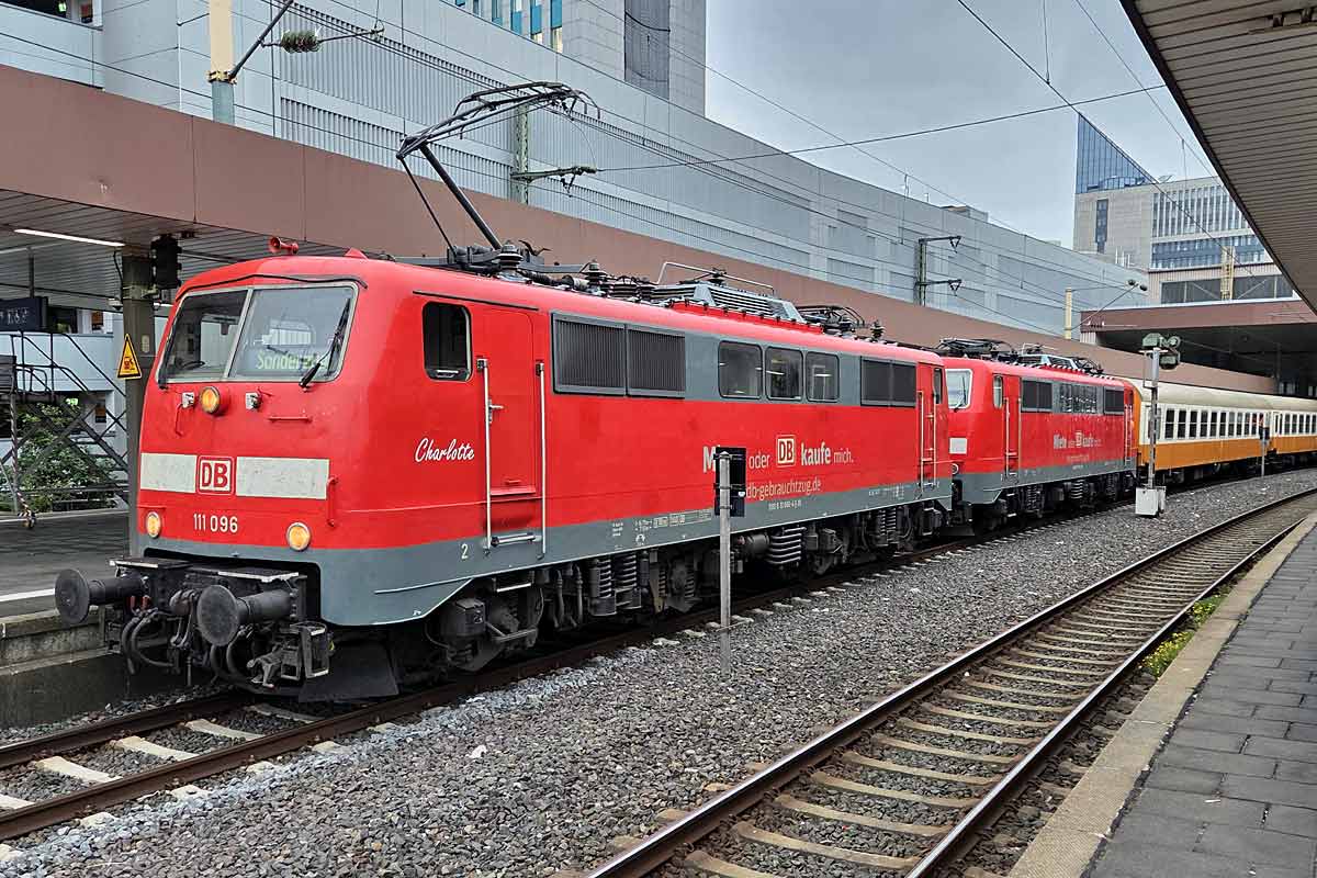 Classic DB Electric loco 111 096 (NVR 91 80 6111 096-4 D-DB) with special MIETE ODER KAUFE MICH title in double traction with a similar unit leading a Sonderzug at Dusseldorf HBF. 10/10/2025