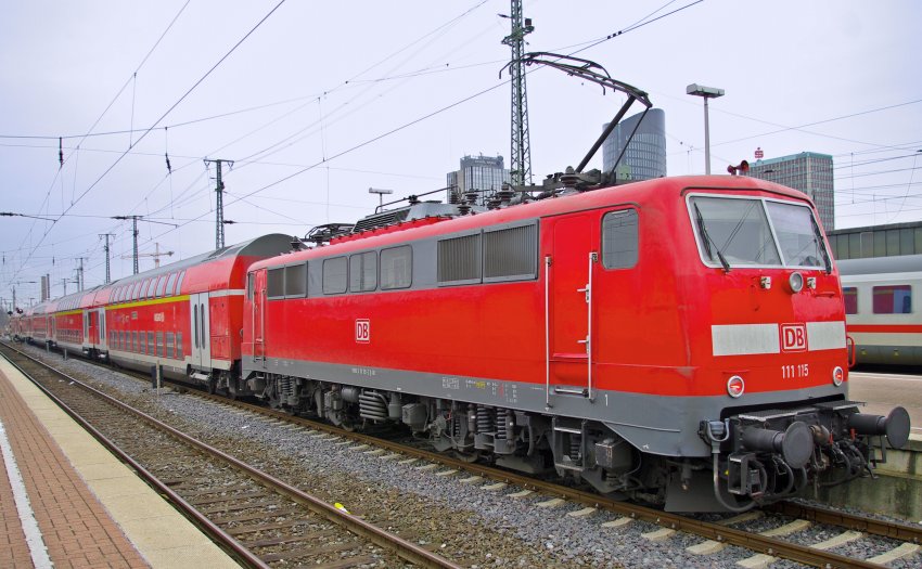 Deutsche Bahn - 111115-2 Lok 111115-2 in Ludwigshafen Mitte am 06. April 2010. Die Fahrzielanzeige lautet auf Saarbrücken HBF.