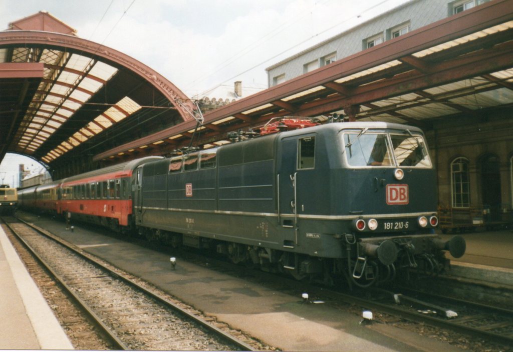 | DB 181 210 with Offenburg-shuttle -consisting of old SNCF USI-stock- waits in STrassbourg for the hop over the Rhine, 23 July 1999 Scanned photo by Leon Schrijvers Leon2711schrijvers@yahoo.co.uk |
