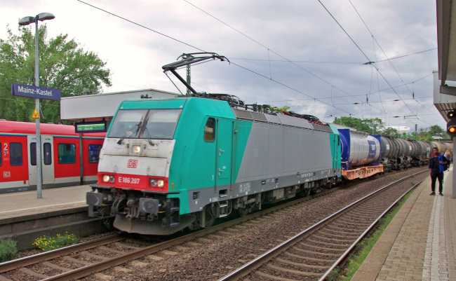 DB E186 207 passed Mainz-Kastell on 15th of September 2021. It is not very common that a rented locomotive get DB-markings. Photo ©Arnim v. Herff |