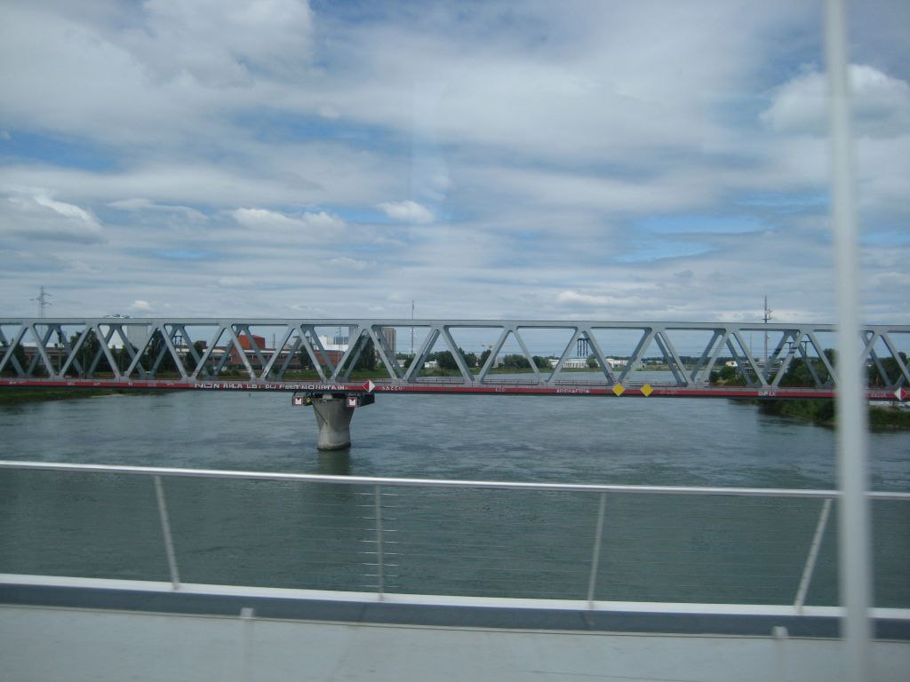 French-German Rhine Bridge on the Strasburg-Appenweier line, seen the Europe Road-bridge, looking towards Strasburg.