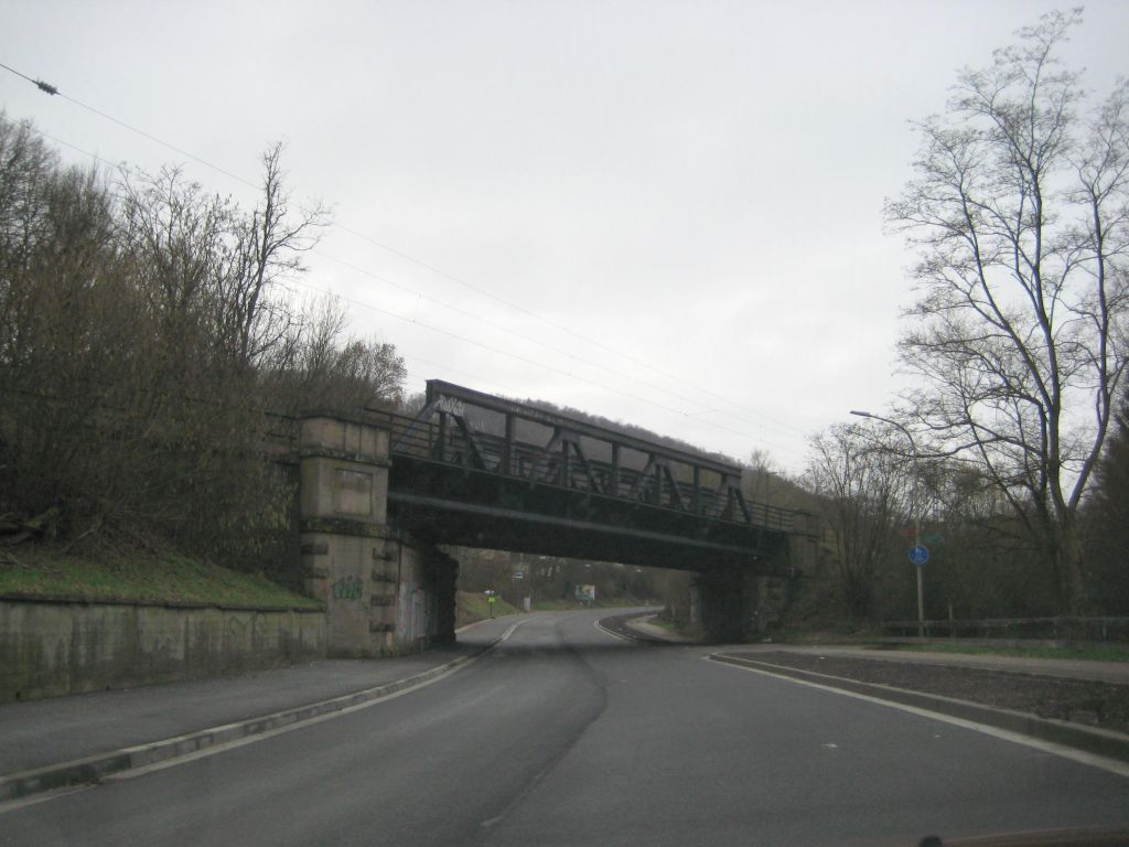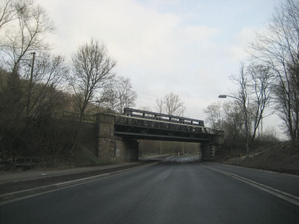 DB Brücke über die Kaiserstrasse am Ortseingang von Scheidt (Saar). Februar 2016. Blick von Scheidt aus. Diese Brücke markierte einst die bayrisch-preussische Grenze, heute ist es nur die Grenze zwischen Saarbrücken und St. Ingbert. Die Kaiserstrasse war einmal die B40, heute ist es nur eine Landesstrasse. Photo by M.Koblischka |