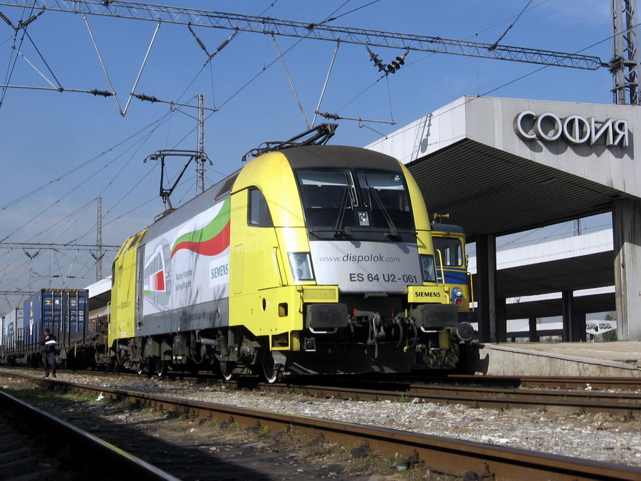 New locomotive for BDZ ES64U2-061 at railway station of Sofia on a freight to Plovdiv. The locomotiven is conceded for BDZ for use for one year.