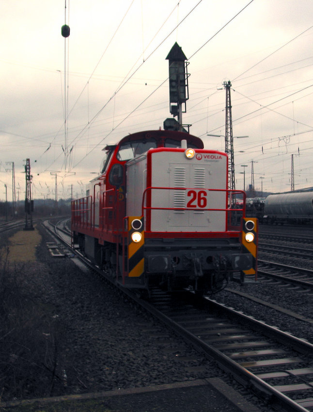 Dortmunder Eisenbahn (DE) 26 passed Hagen-Vorhalle on 12th of January 2008. Locomotive shows its new livery of DE's owner Veolia. Photo ©Arnim v. Herff |