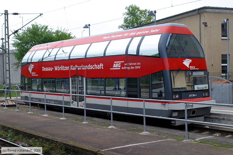 | Triebwagen 670 006-6 der DVV-Stadtwerke Dessau. Aufgenommen 2006 in Dessau Hbf Aufnahme: W. Menzel (info_wm@arcor.de) |