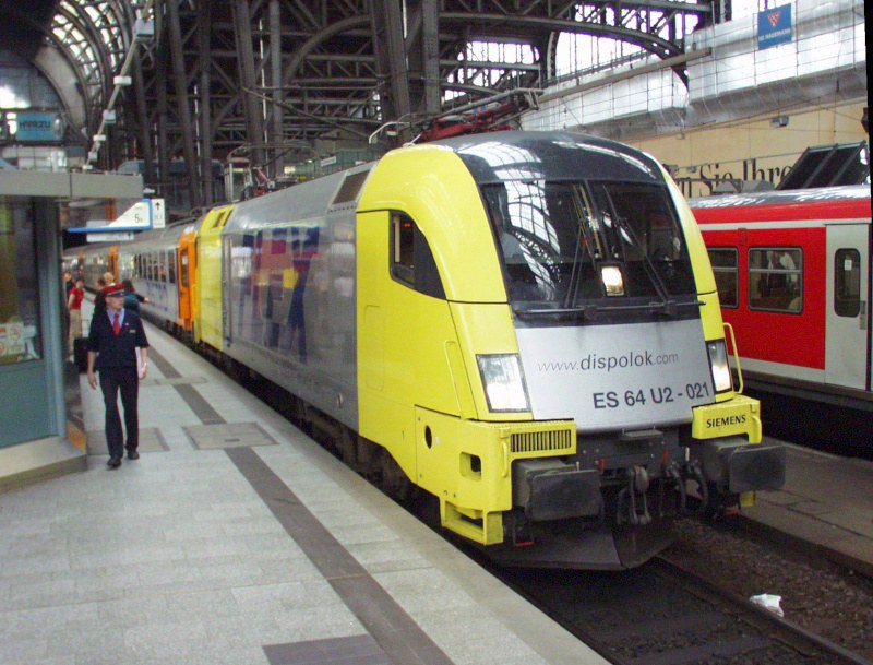 Az FLX 84131-es járat az ES 64 U2 - 098. sz. mozdonnyal 2003.08.04-én indulásra vár Padborgban (Dánia) Hamburg Hbf. felé. (FLX=Flensburg-Hamburg Express)