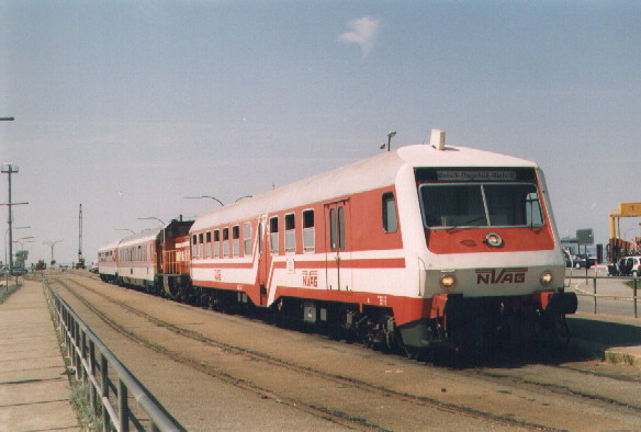 One of the Jenbacher built NVAG-railcars in Niebüll, Germany waiting for the departure to Degebüll on July 6th 2003. The through-cars from Hamburg are already coupled. Photo by Markus Schreilechner (markus@schreilechner.at) |