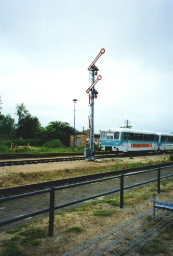 Railbus 771 017-1 of the Usedomer Bäderbahn passes a signal in Zinnowitz,