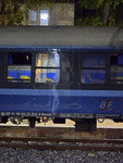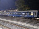 A couchette car with number 51 56 05 70 519 - 0 type "Bocmh" of ZSS ("Zeleznicna Spolocnost Slovensko / Slovakian Railways) at central railway station Plovdiv in composiution of an OPTIMA train.