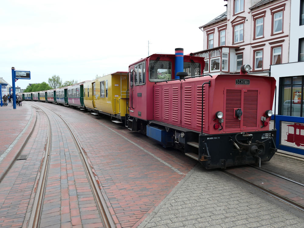 Borkumer Kleinbahn - Germany Diesel locomotive "Aurich" seen in Borkum Bahnhof with a rake of coaches, ready to depart to the ferry port (Fährhafen"). Borkum, 10-05-2018 Digital photo by Marco van Uden |