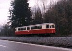 Triebwagen 187 011 ist am 24.02.2001 aus dem Bahnhof Alexisbad in Richtung Harzgerode ausgefahren.