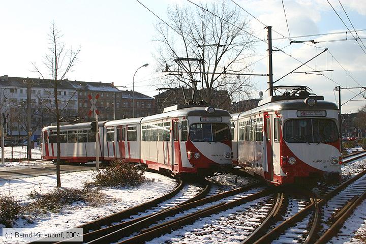 OEG 84 und 109 Begegnung der Triebwagen 84 (links im Bild) und 109 in Mannheim zwischen den Haltestellen Collini-Center und Neckartor. Die kaum noch genutzten Gleise rechts enden nach wenigen Metern vor der früheren Endstelle Kurpfalzbrücke. (26. Februar 2004)