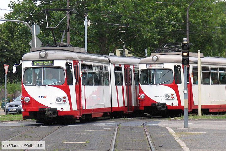 OEG 107 Triebwagen 107 (links) und 85 (rechts) in Mannheim nahe der Kurpfalzbrücke am 24. Juli 2005.