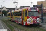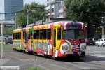 OEG - 115 Triebwagen 115 mit seiner bunten Miramar-Werbung auf Linie 5 in Mannheim an der Haltestelle Universitätsklinikum am 22. Juni 2009.