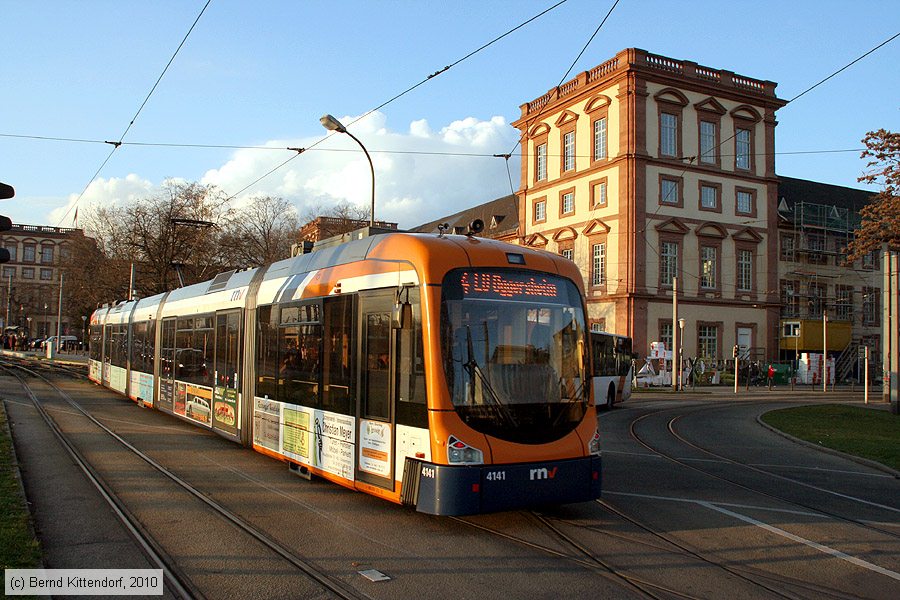 RNV (ex OEG) - 4141 Triebwagen 4141 auf Linie 4 in Mannheim bei der Haltestelle Universität, aufgenommen am 27. November 2010.