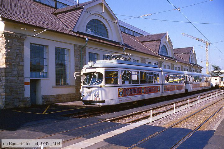 RHB - 1013 Triebwagen 1013 wartet in Bad Dürkheim neben der Wagenhalle der Rhein-Haardtbahn (03. Juli 1985).