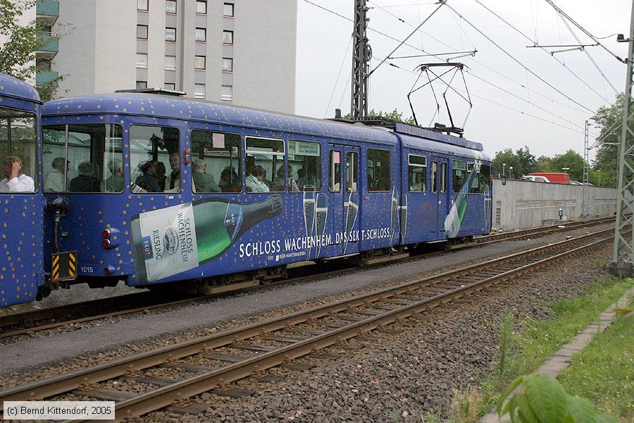 Rhein-Haardtbahn - 1015 Triebwagen 1015 mit Werbung für den Sekt Schloss Wachenheim am 18. Mai 2007 in Ludwigshafen am Berliner Platz.