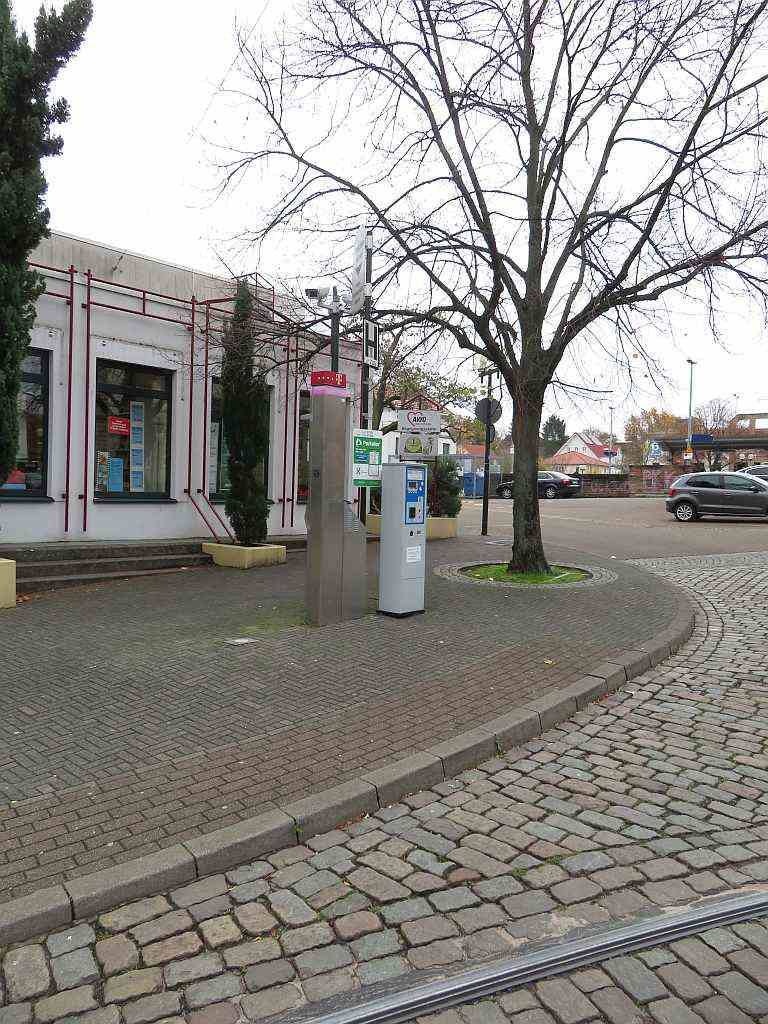 RHB Endhaltestelle Bad Dürkheim Bahnhof. November 2023. Nein, kein Fahrkartenautomat -- hier gibt es Parkscheine und ein Telefon! Photo by M.Koblischka |