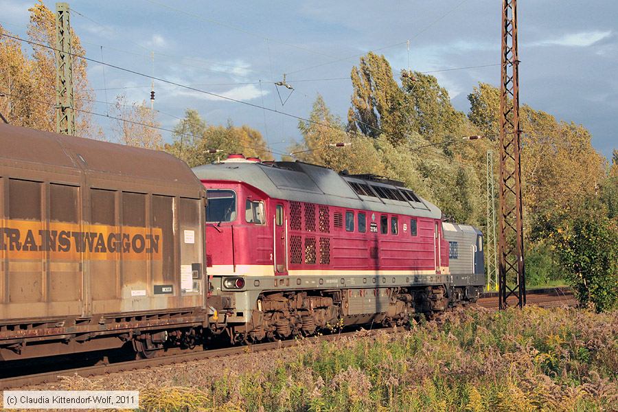 DR diesel locomotives class 232 #158 and 234 #304, Nossen LEG 232 158 and DB 234 304 at Nossen roundhouse during a rail festival. Visible on the right: Fireless locomotive TGK2, 52 8029 on the left. Photo taken Sunday 18 April 2010. Photo: Steffen Mokosch (Steffen.Mokosch@web.de) |