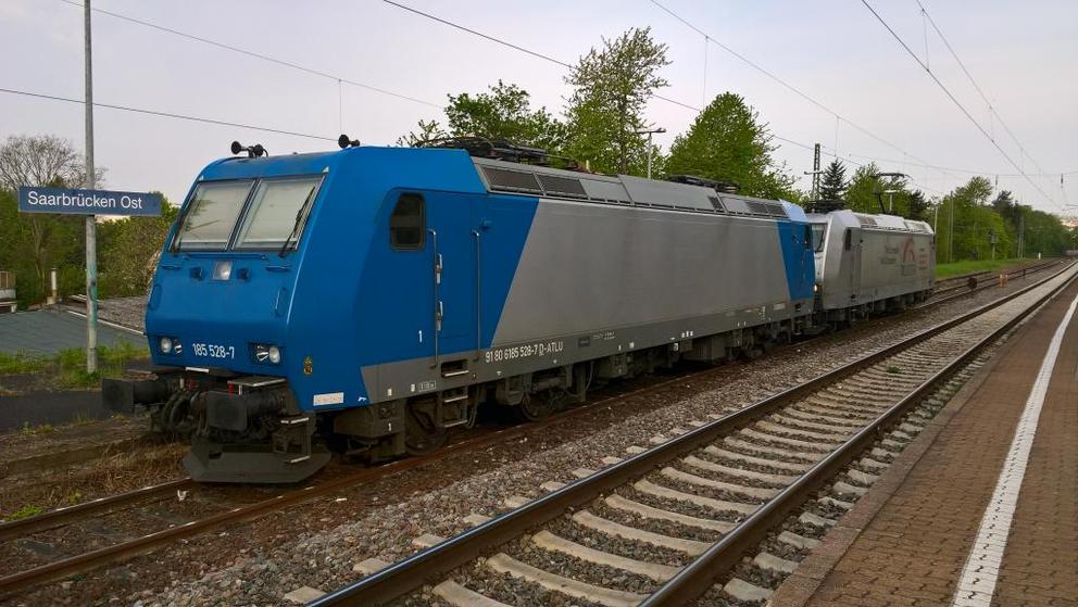185 528-7 (angeschriebene Nr. 91 80 6185 528-7 D-ATLU) und TXL 185 537 in Saarbrücken-Ost. April 2017. Photo by M.Koblischka |