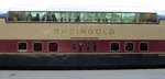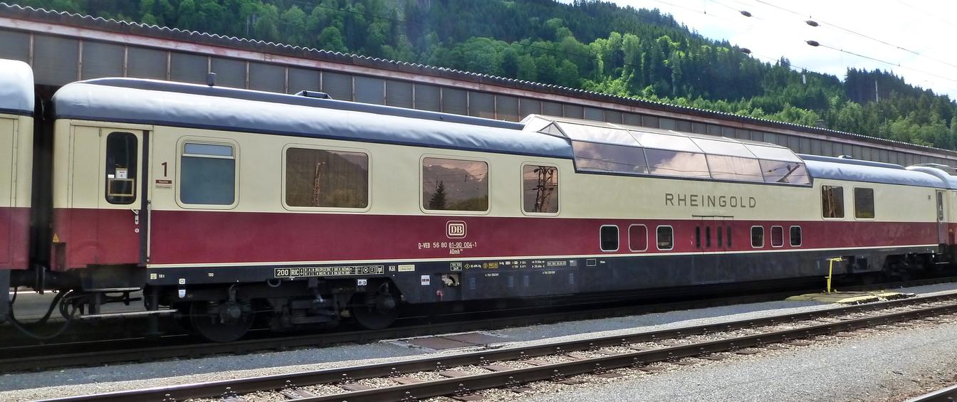 | 56 80 81-90 004-1 ADmh 101, one of five dome cars built 1962/1965 for the DB. The current livery is supposed to represent the state of about 1970, but some details are not accurate: Only the first three cars, with 8 small windows in each row of the dome, had "Rheingold" inscriptions, the others were originally labeled "Deutsche Bundesbahn" there (later removed). The windows have been replaced, originally they had ventilation flaps. And originally only one of the small windows under the dome was an air intake for the air conditioning system, this was changed later for better ventilation. The left third of the car is a bar with tables, the section under the dome consists of air conditioning system, a baggage room (used in this train to store drinks) and originally a postal compartment with telephone booth (should now be used for storage too). The dome has been rebuilt to a smaller profile while working for "Apfelpfeil" in the 1970s/80s, including new lights along the sides. Right of the dome was originally a small train office compartment, now a wardrobe, followed by two six-seat compartments (same as Avmz 111) and a toilet. Near Selzthal, 2012-05-26. |