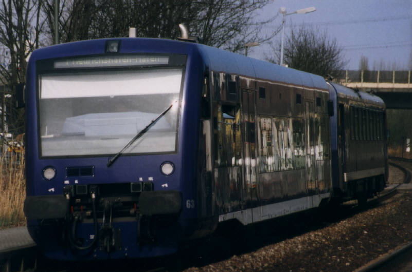 BOB - Germany The Bodensee-Oberschwaben-Bahn operates local trains on the line Aulendorf-Ravensburg-Friedrichshafen. Two Regioshuttles - with VT63 leading - are waiting to depart. Aulendorf, 26/02/2001