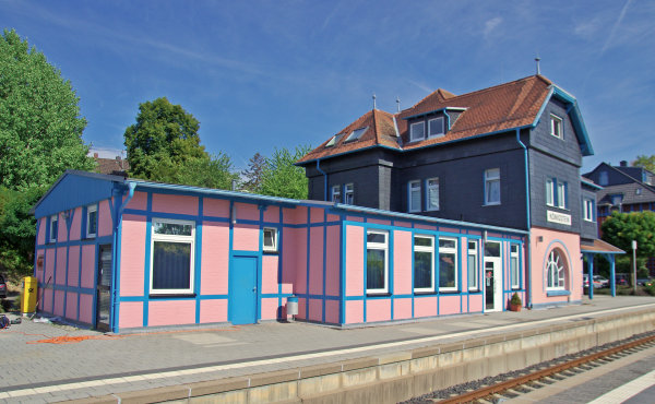Frankfurt_Königsteiner Eisenbahn (FKE - "Taunusbahn"): Station building Königstein seen from tracks on 23rd of August 2022. |