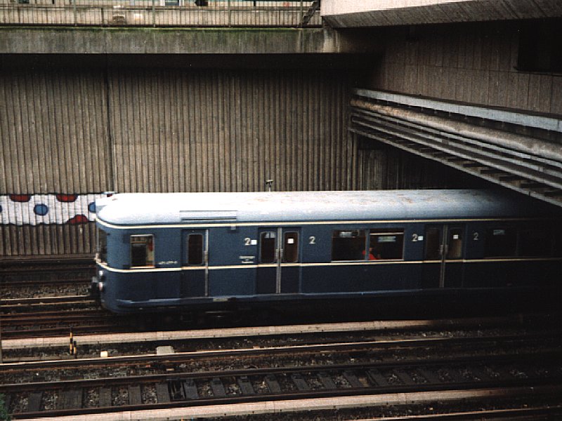 | Hamburg-Altona S-Bahn station This is an old S-Bahn train. This is S-11 to Ohlsdorf-Poppenbüttel, which will cross the bridge between the Aussenalster and Innenalster (the lake of Hamburg). Altona is a four-track underground station, with two central platforms. The S1, S2 and S3 go from Altona through Hauptbahnhof on the underground section between Reeperbahn and Jungfernsteig. Photographed July 1997. (C) 1997, 2005 by Josh Hanz (josh_hanz@hotmail.com) |