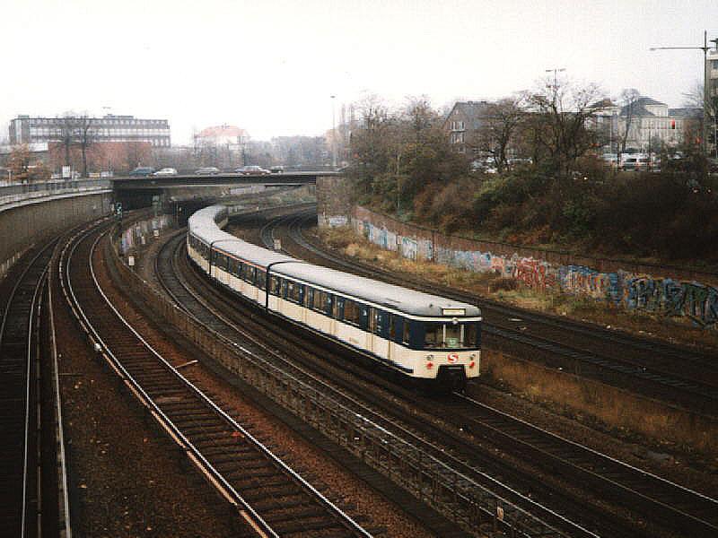Westbound two-unit trainset of the S-Bahn Hamburg (Hamburg mass rapid transit) class 471 in the front and class 472/473 in the rear heading towards Berliner Tor station. This is a train of Line S1 from Poppenbüttel to Wedel. Picture taken on November 23rd, 1997.
