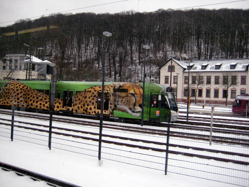 Saarbahn 1001 mit Ganzwerbung "Saarbrücker Zoo" in Brebach. Januar 2013.