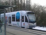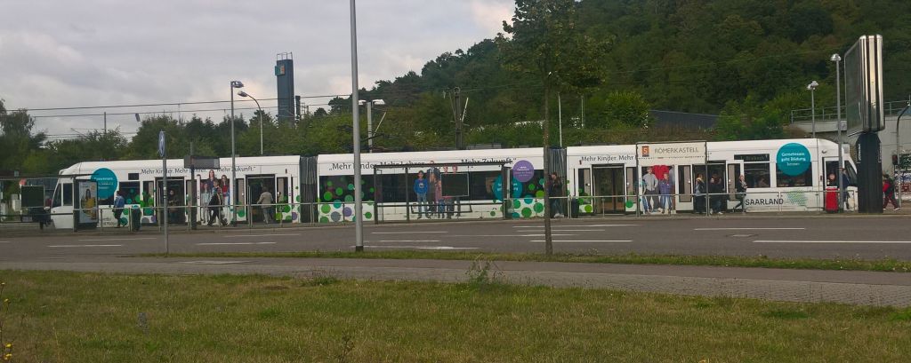 Saarbahn Tw 1009 mit neuer Folierung "Mehr Kinder, mehr Lehrer, mehr Bildung" am Römerkastell. Januar 2016. Photo by M.Koblischka |