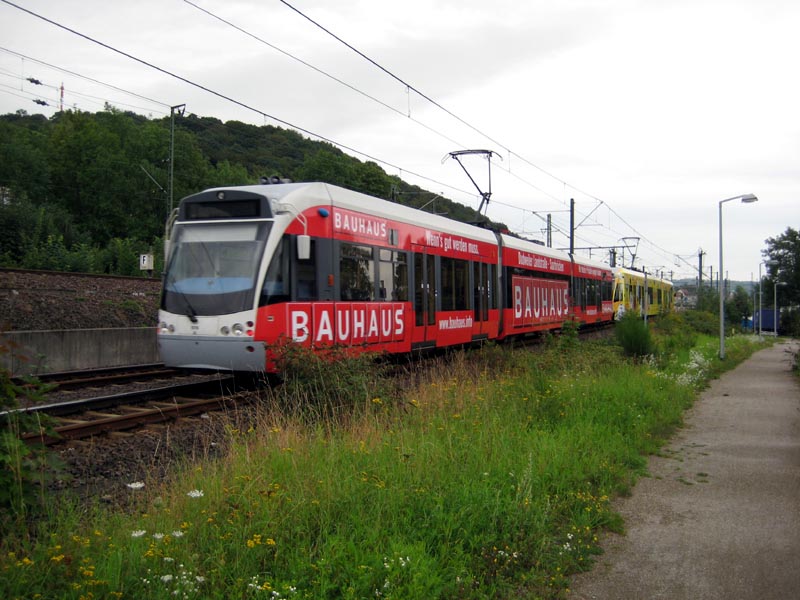 Saarbahn 1016 mit Ganzwerbung "Bauhaus" zwischen Römerbrücke und Brebach. Die Tram benützt