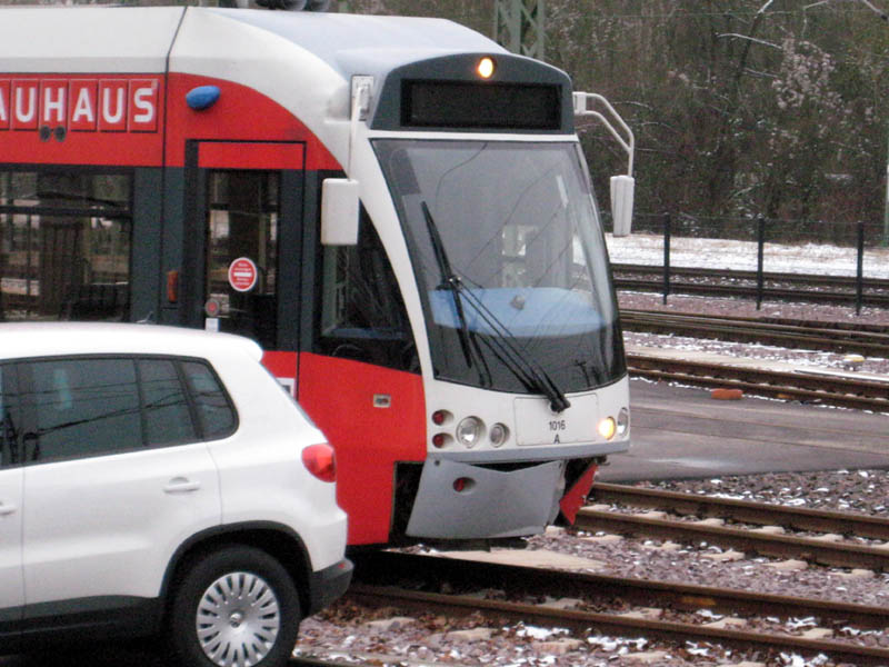 Saarbahn 1016 "Bauhaus" nach Unfall im Depot Brebach. Januar 2013.