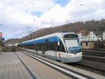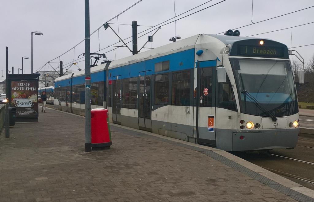 Saarbahn Tw 1028 (ihne Werbung) am Römerkastell. März 2017. Das "gerupfte Huhn" der Saarbahn... Photo by M.Koblischka |