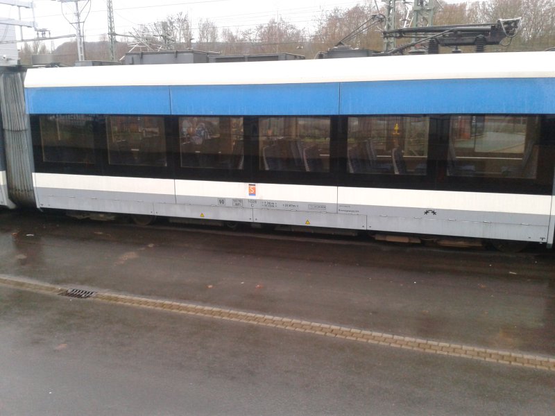 Saarbahn Tw 1028 am Römerkastell. Februar 2017. Immer noch stark "gerupft" nach Abnahme der Folierung. Photo by M.Koblischka |
