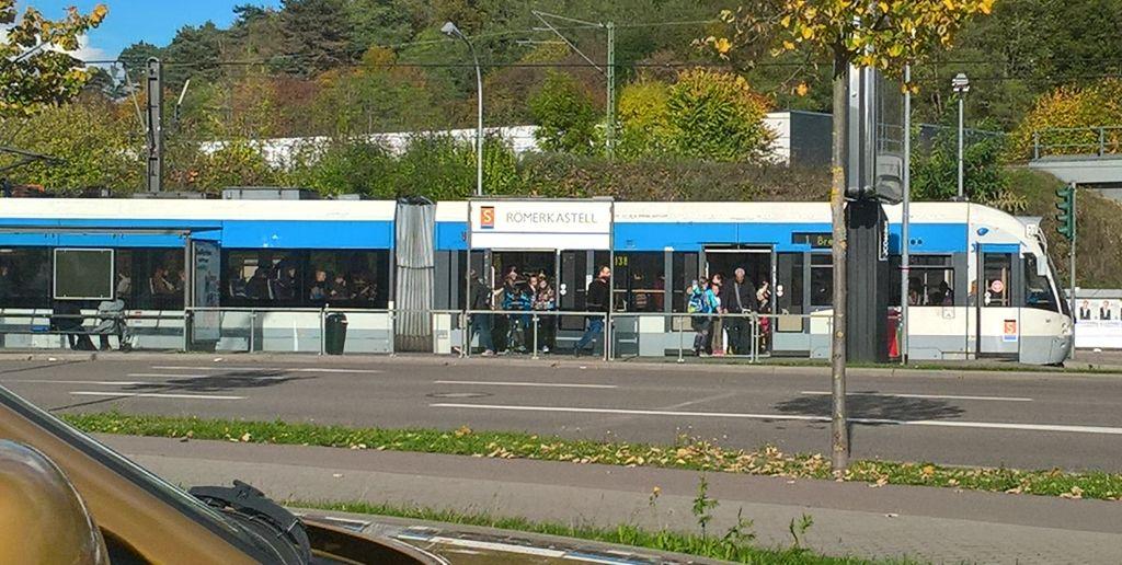 Saarbahn Tw 1028 (jetzt wieder ohne Werbung, aber dafür stark "gerupft") am Saarbrücker Römerkastell. Oktober 2016.