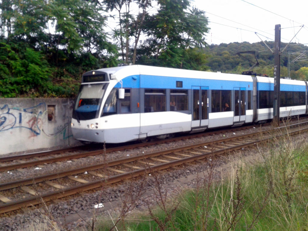Saarbahn 1028 (ohne Werbung) am Römerkastell. September 2014.