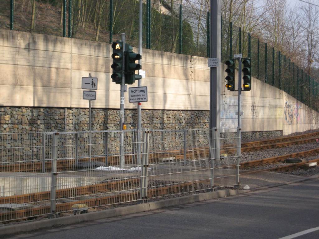 Saarbahn Haltestelle Güchenbach. Februar 2015. Die Anzahl der Hinweisschilder ist enorm. Die Fussgänger sollen den Ampelruf am Mittelbahnsteig betätigen, da zwischen Strasse und Gleis kein Platz zum Wartem ist... Photo by M.Koblischka (koblischka@t-online.de) |