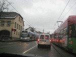 Saarbahn Haltestelle Riegelsberg-Rathaus. Februar 2015. Die Aufnahme ist vom Auto aus entstanden, und zeigt, wie eng es hier zugeht. An dieser Stelle dient der Gehweg als Bahnsteig, und die Hauptstrasse Richtung Lebach teilt sich mit dem Gleis (Richtung Lebach) den Platz. Photo by M.Koblischka (koblischka@t-online.de) |