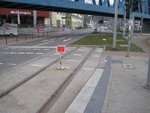 Saarbahn Haltestelle Römerkastell. März 2013. Das dritte Gleis der Haltestelle endet unter dem DB-Viadukt und soll der Erweiterung Richtung Schafbrücke dienen. Photo by M.Koblischka (koblischka@t-online.de) |