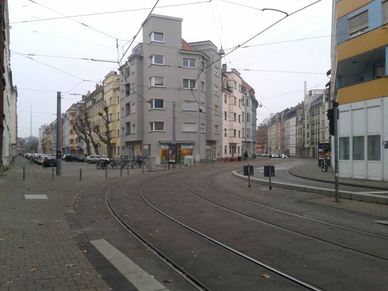 Saarbahn Haltestelle Uhlandstrasse. November 2014. Blick Richtung Hellwigstrasse. Die Großherzog-Friedrich-Strasse läuft geradeaus weiter, die Bahn biegt hier ab Richtung Mainzer Strasse. Photo by M.Koblischka (koblischka@t-online.de) |