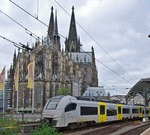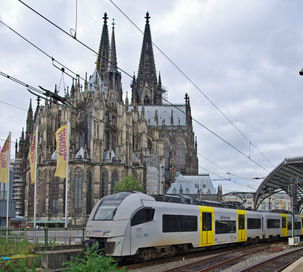 | trans regio belongs to EuRailCo (= transdev), formerly known as connex/veolia, a conglomerate based in France. Since 2008 they are operating the MittelrheinBahn Köln - Koblenz with 16 Siemens Desiro Mainline units (leased from Alpha Trains). Passengers don't need to worry about all these complicated constructions as the tickets of the integrated fare systems are valid. Köln Messe Deutz, 2013-08-01. This train just ended here so it's not displaying red or white lights or destinations. |
