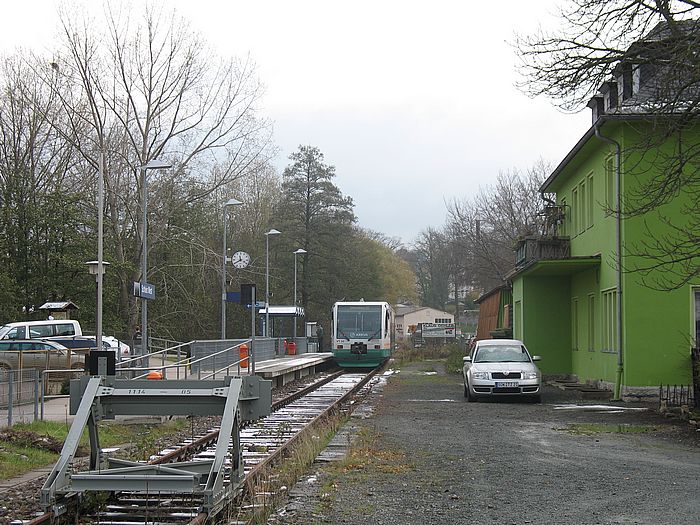 Vogtlandbahn local train from Plauen oberer Bahnhof after arrival at Schleiz West. The green building on the right is the former station building with a restaurant inside. The platform is now on the left, where you can change to local busses at the bus terminal. 3.11.2006 Martin P.