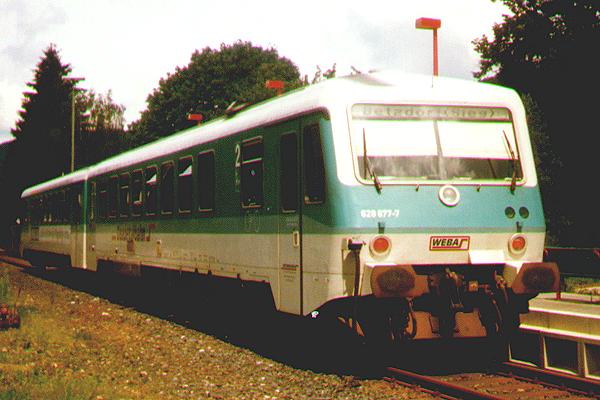 Triebwagen 628 677-7 / 928 677-4 der Westerwaldbahn (WEBA) in Daaden am 01.08.1998. Railcar 628 677-7 / 928 677-4 of the Westerwaldbahn (WEBA) in Daaden on 08-01-1998. Foto und Scan von Volker Gelmroth, http://www.comports.com/pribahn. |