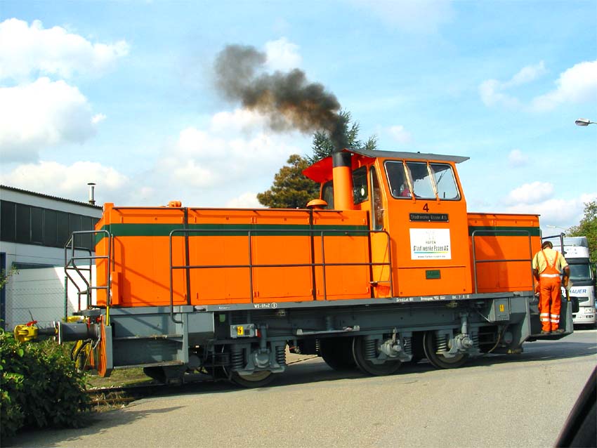 Locomotive no. 4 of Stadtwerke Essen AG (company wich has to service local infrastucture of the town and is owned by the community). It has around 20 km own tracks mainly in North of Essen. 27th of December 2002. Photo by Arnim v. Herff (arnimvherff@uni-duisburg.de) |