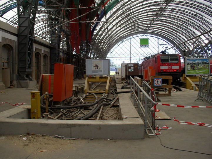 Dresden Hbf rebuilding works View of Dresden Central Station during its 1997-2006 refurbishment. Assessments of the structure revealed that the steel arches of the train shed had even been distorted out of alignment by wartime damage. It was also discovered that the structure had been damaged by corrosion since the war, rendering it unsuitable to carry the weight of a glazed roof and leading architects to use lightweight fabric instead. Photo taken Sunday 18 May 2003. Photo: Steffen Mokosch (Steffen.Mokosch@web.de) |