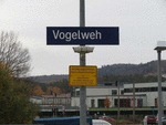 DB Haltestelle Kaiserslautern-Vogelweh. November 2023. Bahnhofsschild. Die Warnung vor den Zugdurchfahrten ist gerechtfertigt, schliesslich verkehren hier auch die ICE/TGV Frankfurt-Paris. Photo by M.Koblischka |