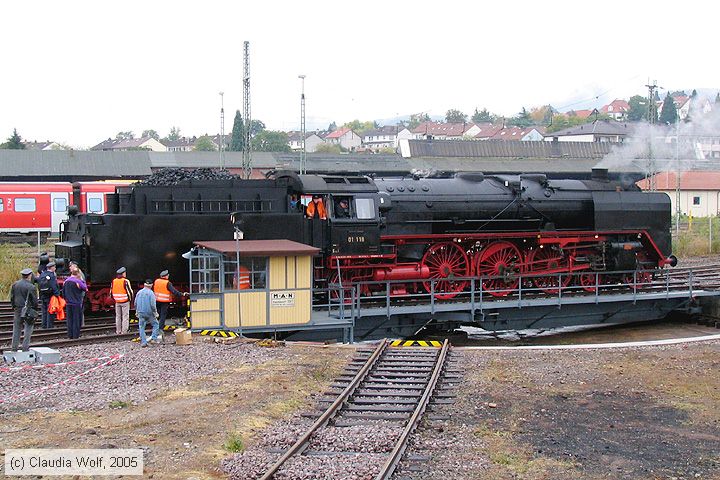 Dampflok 01 118 Dampflokomotive 01 118 am 01. Oktober 2005 in Neustadt (Weinstraße) auf der Drehscheibe im Betriebswerk. Unter der Bezeichnung Tempo, Takt und Dampf 2005 gab es in Rheinlandpfalz eine größere Plandampf-Veranstaltung. Zahlreiche planmäßige Nahverkehrsleistungen wurden in der Zeit vom 01. bis 03. Oktober 2005 durch Dampfzüge gefahren. Außer bei den großen Rundfahrten Neustadt (Weinstraße) - Mannheim - Karlsruhe - Winden - Landau - Neustadt (Weinstraße) verkehrten Dampfzüge zwischen Neustadt (Weinstraße) über Winden nach Wissembourg in Frankreich, zwischen Winden und Bad Berzabern und auf der Strecke Neustadt (Weinstraße) - Winden - Wörth - Karlsruhe - Germersheim - Speyer - Neustadt (Weinstraße).