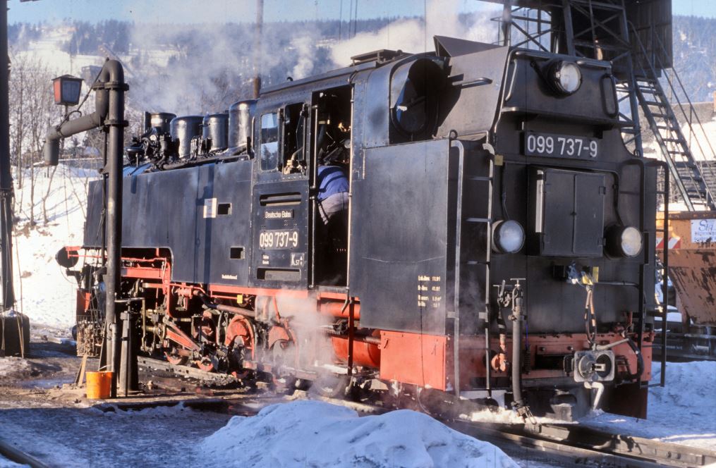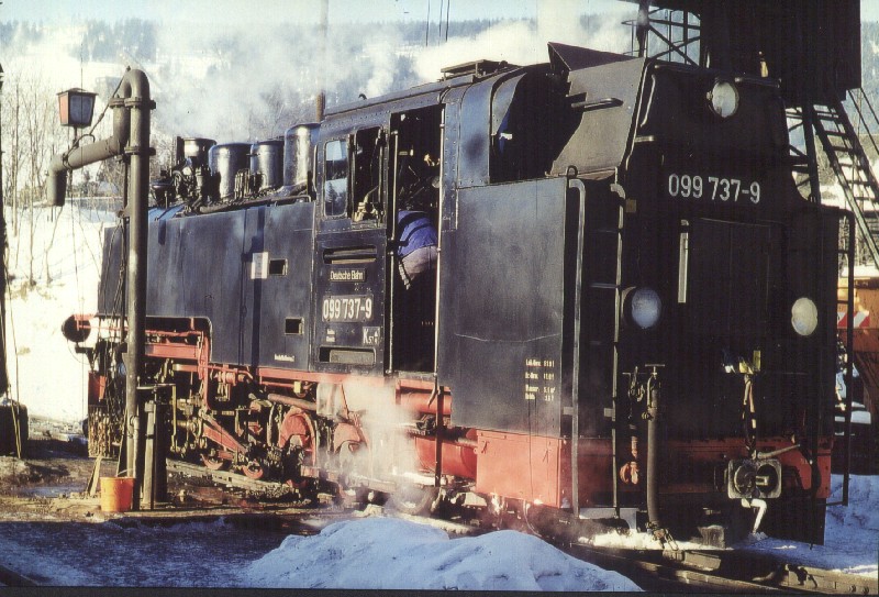 | Kurort Oberwiesenthal .Cleaning up the fire . Steam lcoc. 099 737-9 of Fichtelberg Bahn Febr.96 hatwuo@zeelandnet.nl |