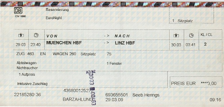 DB seat reservation München-Linz for train EN 463. 29.3.2009 Martin P. |